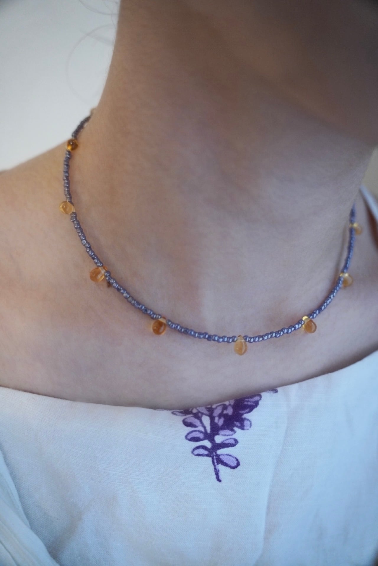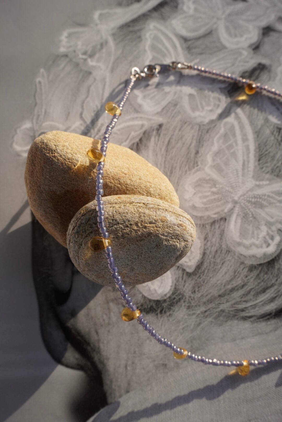 そんな情景をイメージして、淡いパープルとアンバーのビーズを組み合わせました。